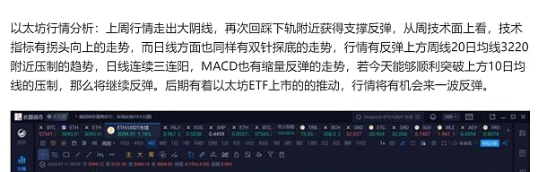 以太坊行情分析:上周行情再次回踩周线下轨附近的支撑反弹且大阳线有吞没上上周阴线一半的走势,从技术指标上看也有拐头向上的走势,行情有反弹中轨3400压制的走势。而日线方面,上周长路就有讲到行情连续三连阳,技术指标也是向上的走势,整体行情处于反弹走势中,昨天的一波反弹突破了中轨附近的压制,早间回踩中轨支撑并未跌破继续反弹,若是顺利突破3300的压制,那么徐亚哦关注到上方60均附近3340的压制。