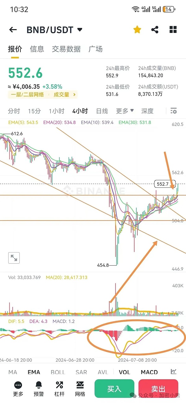 2、EMA10 20 30 呈现多头排列后续看涨!