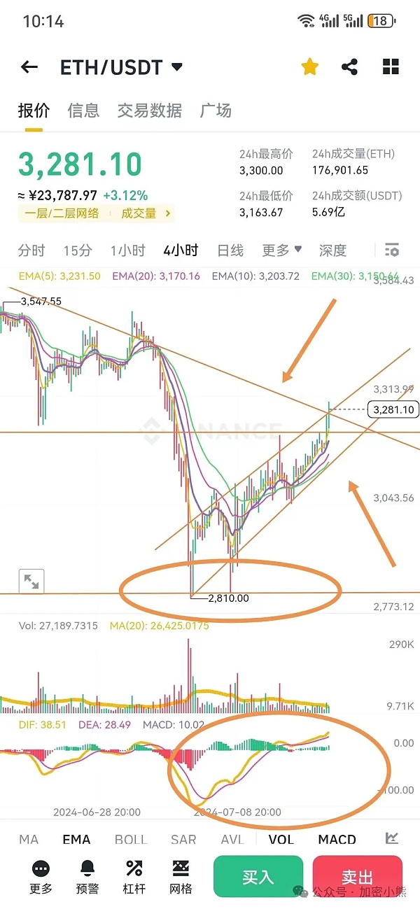 总结:突破下跌趋势线方可入场,3600见(现在入场也可,反正羡羡看涨)