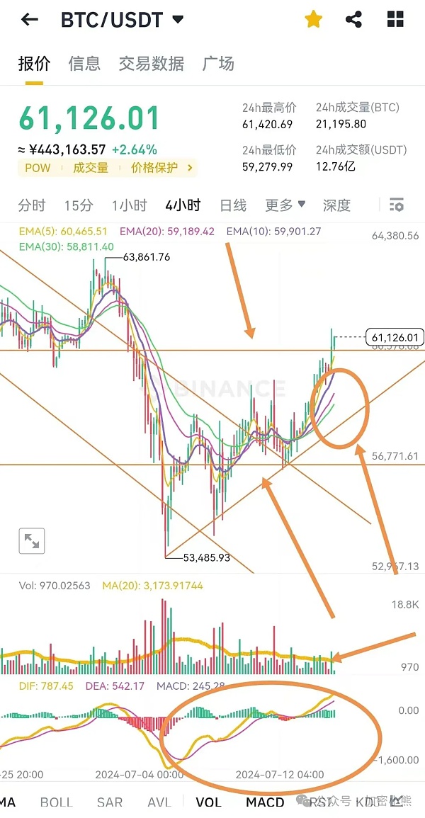 总结后续行情看涨,下波行情63500见(文章还没写完就要到63500了),也可能一举突破,直接67100见!