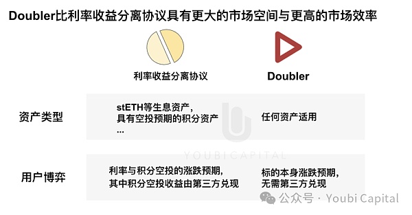 今年,基于生息资产的收益率分离协议由于其创新的设计打开了新的需求市场。Doubler Lite的资产收益权分离与基于生息资产的收益率分离协议(后文简称利率衍生品)看似具有一定的相似性,实则市场需求与用户博弈点完全不同。