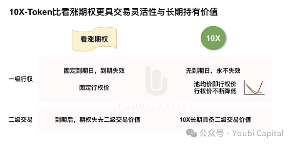 从期权二级市场交易价值对比,传统期权在接近到期日时,若没有达到行权价,该看涨期权将面临失效,因此逐渐失去二级交易价值。反观10X代币,因为没有到期日的限制,10X代币将永久保留二级交易价值,核心博弈在于用户的成本与未来上涨预期的不同。