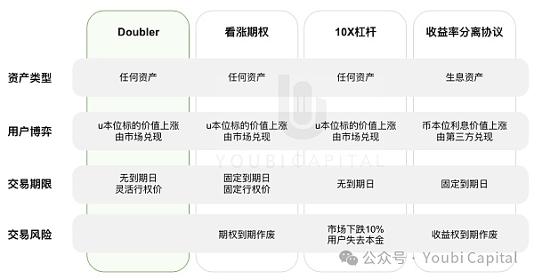 利率衍生品拆分币本位资产与其资产属性所带的生息部分,所适用的资产类型有限,目前市场上常见的资产类型有质押与再质押资产、具有动态收益的稳定币资产以及具有空投预期的积分资产。而Doubler Lite拆分U本位成本与资产价值上涨带来的盈利部分,任何资产皆可适用,市场空间更为辽阔。
