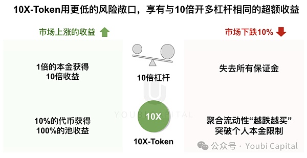 用户承担的风险在于10X代币在池亏损的状态下并不具有实际价值。但由于10X代币能够二级流通,只要有用户看好标的物未来的上涨趋势,即可随意退出。相比较于下跌10%便失去全部本金的杠杆市场,10X代币能够对抗市场高波动性,为超额收益提供了更低的风险敞口。