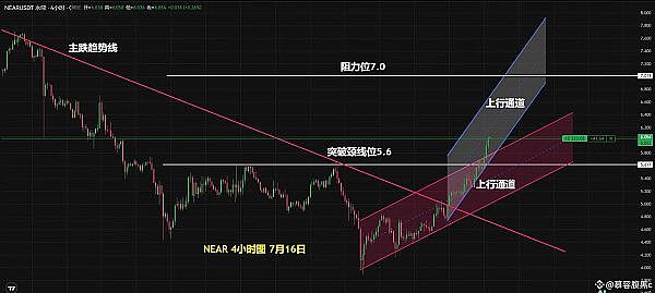 $NEAR 从4小时结构上看今天凌晨突破了颈线位置5.65 并且形成了新的上行通道,目前6.05的价格可以建仓买入,若是回踩到5.8还可以在继续加仓。阻力位目前7.0 上方还有空间!买入的把止损位放在5.53即可。