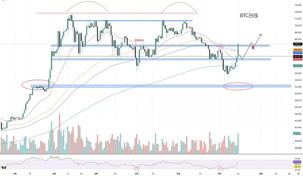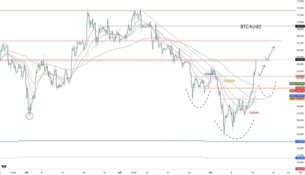在日线级别上25日EMA已经被突破并且突破了60000美元的关口,而从这两点来看目前依旧是一个有望持续上涨的市场。
