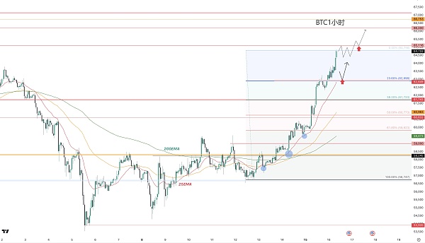 ②在65000〜65200美元附近突破后顺势做多,理想情况下在夯实底部后做多。但为了应对急涨,也可以设置限价单。