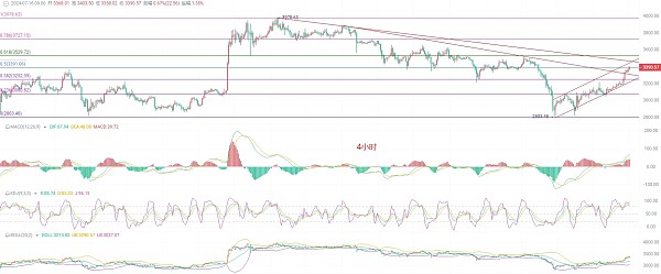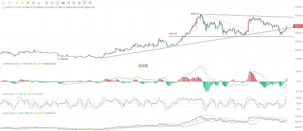 短期受阻分割线0.5压力位3395,四小时K线连续拉伸,EMA趋势指标开始呈现多头趋势,K线破了EMA压力位3270,现在压力变支撑,MACD放量增筹持续,量能增加持续时间太久,KDJ扩散不显,布林带开口K线连续围绕上轨拉伸已经到了3390附近,思路上趋势 由空转多,那么操作可以围绕回踩支撑做多为主,空为辅