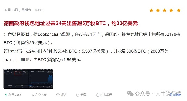 1、德国政府的BTC已经全部卖完了!德国政府在过去的24天内,卖了50179枚大饼,价值约33亿美金!!其实这个钱对于万亿市场的加密货币来说不算多,只不过德国政府卖的时候,有些散户恐慌,再加上机构恶意砸盘!所以跌的比较厉害,目前德国政府已经卖完了,就没有后顾之忧了,这个利空也就变成了利好了;