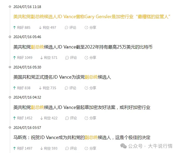 3、特朗普选择的副总统也是一个加密货币爱好者!美共和党副总统候选人JD Vance曾称美国证券交易委员会主席Gary Gensler是监管加密行业“最糟糕的人”,并称其监管加密货币市场的方法“与理想政策完全相反”,对于这样一个爱好币圈的副总统如果当选了,那是相当不错,毕竟他本人也是持有BTC!
