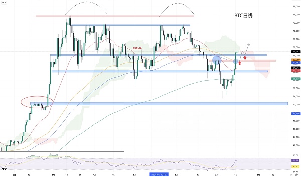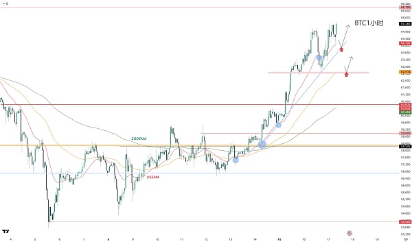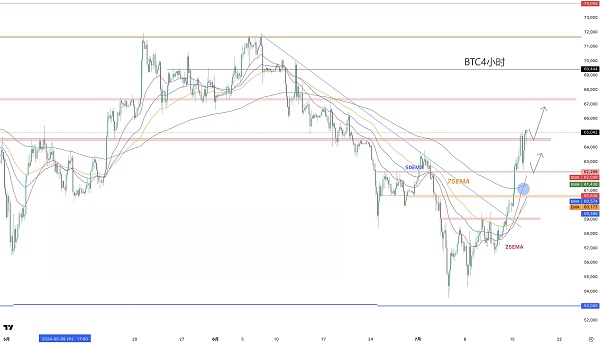4小时级别上突破作了为主要阻力位的水平线,所以需要注意在65,000美元附近形成长下影线并企稳的情况。