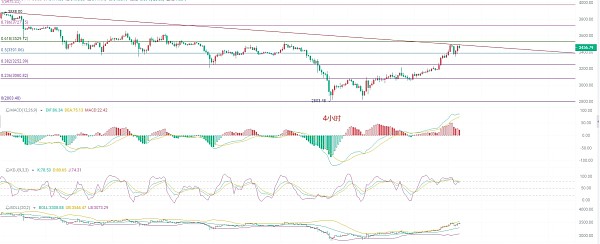 下方3350到3330试仓多,防守3250到3270补仓多,目标3350到3400区间,破位看3450到3500区间落袋,止损3230点