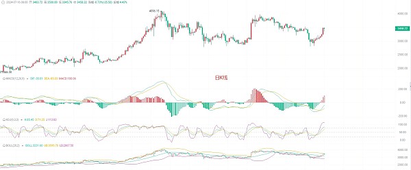 截止发稿前以太坊日K线最高3500附近,最低3345之上,思路上之前说了趋势现在是多头趋势,回踩放在了分割线0.618附近也就是3250到3270布局多,但是最低只是到了3345附近也就是日线级别的EMA趋势指标支撑点最高位,就没有继续往下了,说明短期内会在高位继续盘整,不着急趋势不调不做等就行,MACD放量增筹,KDJ受阻3500以后开始收缩,布林带多空轨道背离,行情预计会再次试探趋势拐点3250到3230区间的动能,所以一定要做好防范
