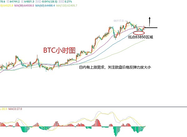 7月18日比特币(BTC)合约技术面分析:今日方面,大周期日线级别昨日报收小阴线,K线形态连阳单阴,价格还是在高位盘整,附图指标金叉放量运行,这样来说大趋势上还是上涨明显优势,而出现的回撤没有太大的力度和延续也就只能是看作修正的一种了,理解不要错了,节奏不要乱了;短周期小时图从昨日欧盘开始价格震荡下行,但却没有破位前面的低点位置,当前K线形态连阳,价格支撑反弹,附图指标快慢线粘合金叉运行,日内大概率还是有一次冲高的走势,需要关注力度大小;因此今日BTC短线合约交易策略:现价64700区域直接多,止损64300区域,目标看65000区域;