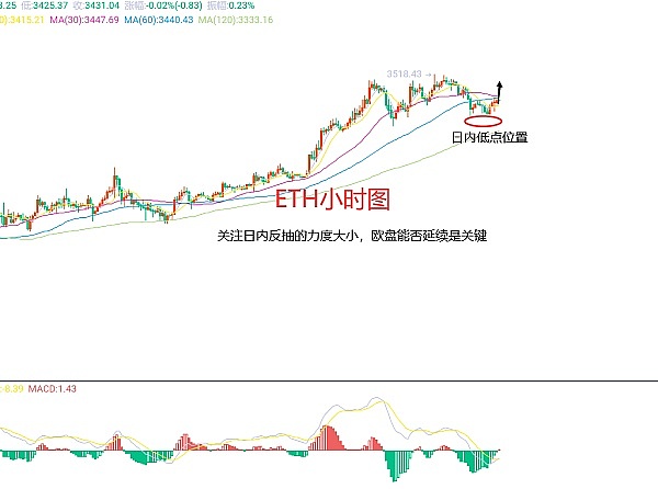 7月18日以太坊(ETH)合约技术面分析:今日方面,大周期日线级别昨日报收小阴线,K线形态上连阳单阴价格运行在均线上方,附图指标金叉向上,虽说出校小幅度的回撤走势,但可以看到的是价格回撤没有力度和延续,也没有有效的去破位前期的低点位置,所以只能是看作修正的走势对待;短周期小时图昨日欧盘到凌晨价格震荡下行,时间长但幅度不大,没有去向下延续破位,在早间价格开始支撑反弹,当前K线形态连阳,附图指标金叉,那么日内大概率是有反弹冲高走势的,因此今日ETH短线合约交易策略:现价3426区域直接多,止损3395区域,目标看3480区域