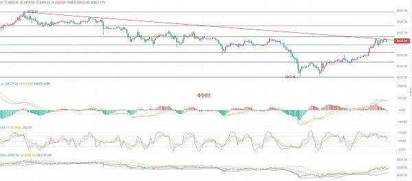 四小时K线目前出现短空趋势,就看EMA15趋势指标3400关口支撑能否提供有力支撑,下一个支撑点关注3330到3300区间的支撑,短空趋势救济金这可以抓一下,稳健者低多为主,毕竟现在大周期出现多头,MACD缩量下行,DIF和DEA高位向下扩散,KDJ向下跳水,布林带也出现后缩,短周期出现空势,四小时K线回踩中轨3390以后能否站稳?下方关注EMA30趋势支撑点不破可以布局