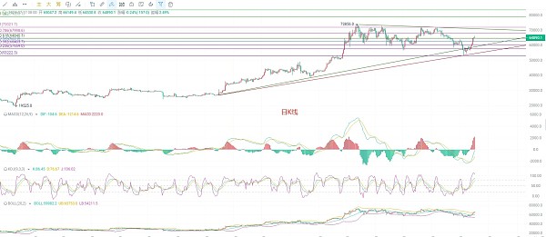 先来复盘一下昨日文章中给的思路66000空还没有到达指定位置,说明了一点急涨急跌的行情短期内结束了,高位盘整回踩的行情来了,短空下方目标关注64000附近的支撑,截止发稿前0点整,比特币日K线最高66150附近,最低64500之上,EMA趋势指标收缩,但是EMA15快线速度并没有太快为K线提供支撑,目前依旧在61000关口附近,MACD持续放量增筹,DIF和DEA开始靠近0轴线,行情出现背离的概率变大,各大指标上移K线慢慢出现回踩,KDJ上行扩散受阻,布林带开口以后多空指标背离,K线破了上轨以后回落到了通道内,不要盲目跟风行情不会一直走单边,