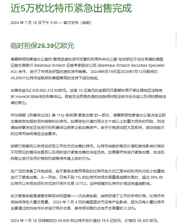 德国政府称此次出售过程持续了约3.5 周的时间,他们共计出售了近5 万枚比特币,获得约26.4 亿欧元的资金。