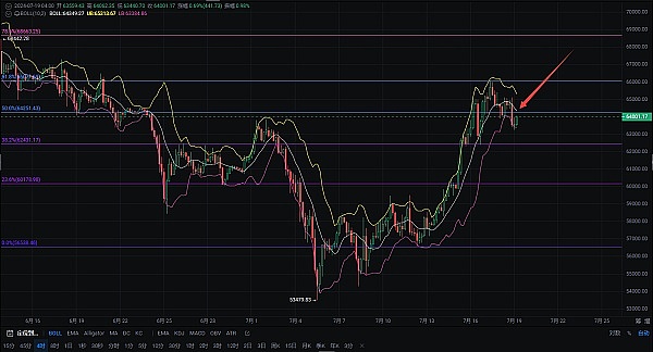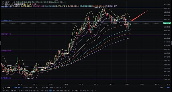 4小时图中布林带通道从前日开始转变成下行通道趋势,当前形成平行下移的状态,并没有收口的迹象,说明下方还存在较大的空间,日内也是可以继续关注中轨位置做空,与小时线上轨位置也比较吻合;MACD中DIF与DEA在高位形成死叉后继续向下扩散,下方空间依旧存在,当前中长线有较强支撑,下方支撑考虑EMA200与EMA60交叉重合处;在EMA60下方还有与EMA150,EMA80,EMA120多线支撑,所以说要指望短期跌破61000-61500关口还是有些不显示,除非有和上轮德轻仓的利空出现!
