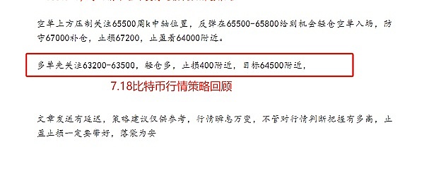 昨日文章中给出的短线参考65500-65800空单参考,日内未达到目标位置,但价格还是如期回调来到下方指定63300附近,部分实仓学员空单已建仓,成本价在63300附近截至发稿已有600多点收益,可正常按目标位止盈,