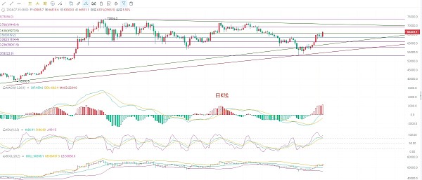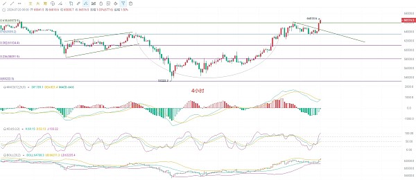 四小时K线破了0.618阻力位 66000,发稿前现价在66500附近,MACD缩量增筹,DIF和DEA上行收口,KDJ上行扩散加上布林带上轨66250失守,短线多头站上高位,急涨急跌行情不追,趋势虽然是多,但是有一点要记住,不要追涨杀跌,这样的习惯不要有,耐心等,等趋势回踩,记住六个字:趋势不调不做