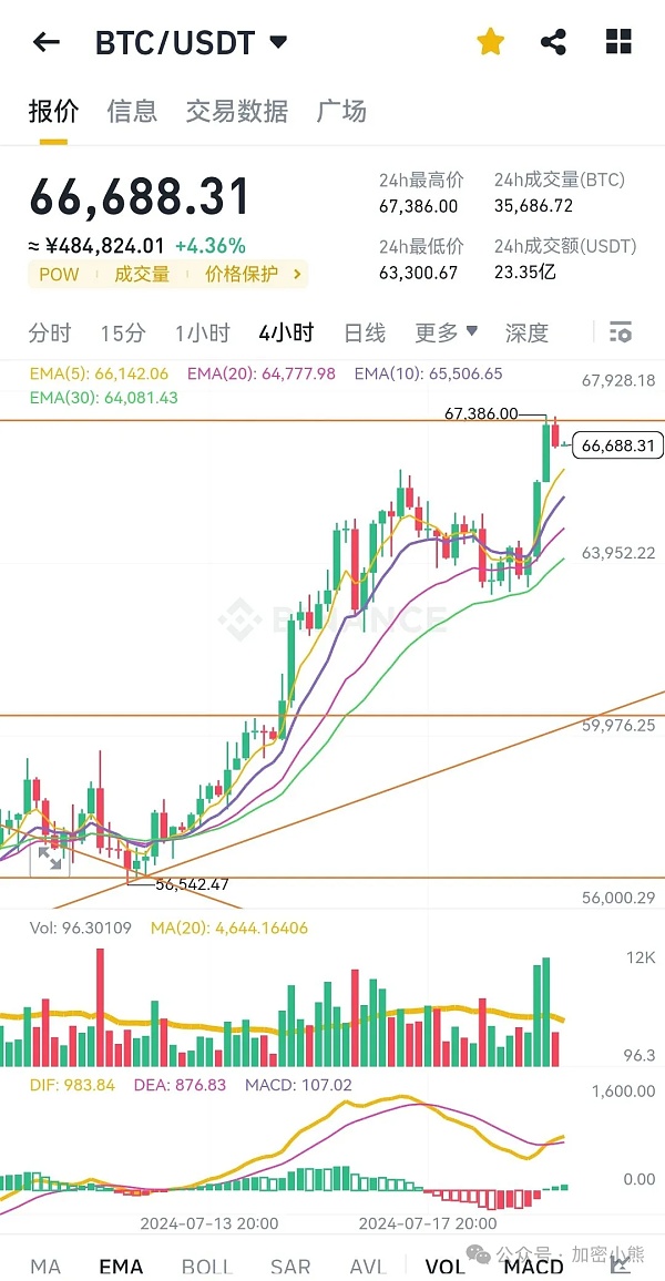 EMA10 20 30继续呈现多头排列。btc 日线级别从底部拉起来来看,刚刚经历了两次简单回调(按道理说走出趋势后只经历一次简单回调)