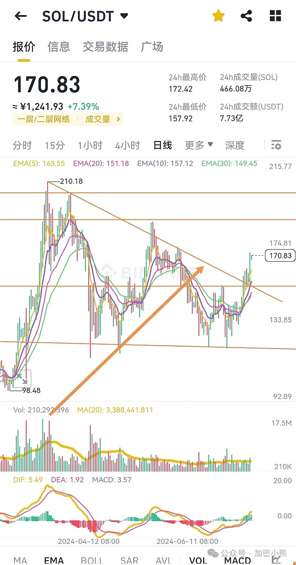 SOL:四小时来看,比较强势,今天还得再拉升一波(盘感)大的要来了 日线级别:突破日线级别下跌趋势线,并且站稳,sol将比btc优先突破前高,让我们拭目以待!