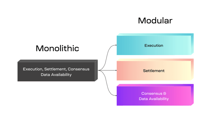 模块化区块链:模块化区块链是每一个层级只做协议中的一部分工作,因此需要外界帮助,必须与另一条链协作才能发挥其作用。
