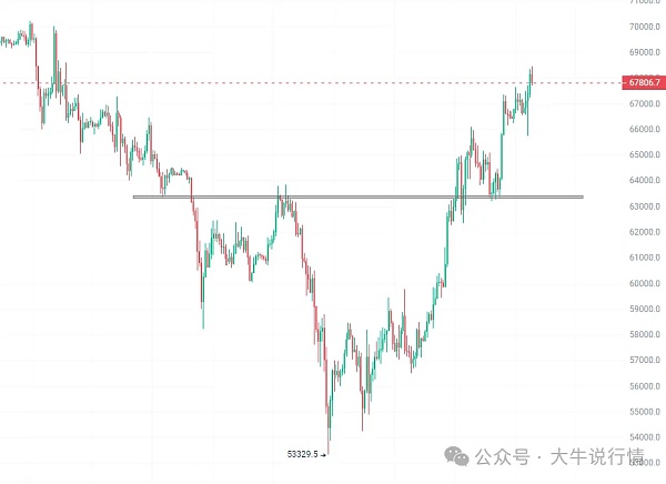 大饼周级强势反弹,收了一根大阳线,目前价格已经回到67800,上70000也只是几个百分点的事,目前大饼在这个点位已经停留4个月了,如果只是派发反而不可能,前面的几个高点都没出现太大的抛压,所以我个人认为未来大饼的价格只会走的更高。4小时上大饼多头趋势依然强势,但明显高位处不建议持续追高,建议等待回调再低多,但如果没有回调直接上行破位,再观察下一段多头走势后的调整。
