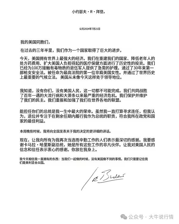 美国总统拜登宣布退出,但是并未明确是退出整个选举,还是退出提名,区别是,退出提名,依旧可以被再次提名,退出大选,则就彻底退出了这次大选。