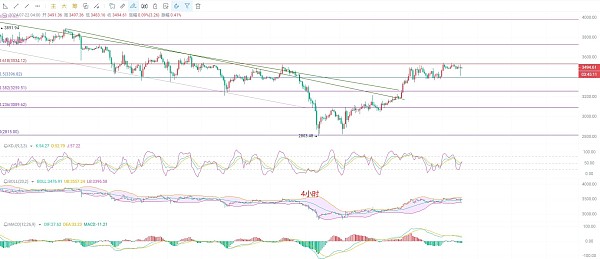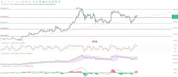 四小时K线连续试探上方前高压力位3540多次,一直都没有突破,EMA趋势指标快慢线拉开距离,波动变大是机会也是风险,整体来看风险大于收益,对于新手小白来说最好的方式就是吃瓜,这种连续试探上方压力位的操作明显是陷阱,不管是多头还是空头都可以尽管其变等待时机,KDJ上行扩散,布林带横盘,四小时K线从中轨支撑3480拉伸上方压力位关注3560,下轨重要支撑已经跌破了3400整体距离从上方3540到下方3350支撑有200点空间幅度,大趋势是多头,思路上等回踩支撑以后再布局最稳,激进者不管是追涨还是杀跌一定要带好止盈止损防止被去中心化
