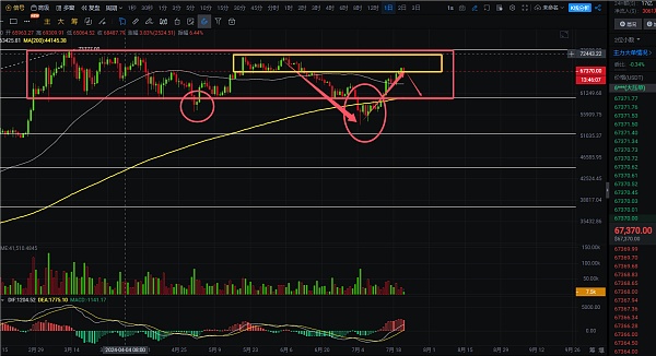 大饼近期在下跌至53485位置后走出反弹,这段时间的反弹基本上没有给到回调机会,截止目前反弹最高点在68474位置;以太下跌至2810位置后也是跟随大饼走一波反弹,目前最高反弹点位在3562位置;这波反弹基本上没有给到很大的回调,大饼反弹接近15000点,以太反弹接近3300点,这波反弹可能已经到顶了,后市需关注高点破位;