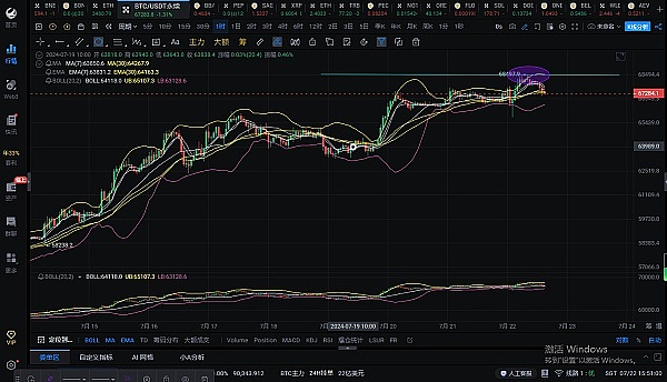1;哈里斯表示希望赢得民主党总统候选人提名; 2.马斯克将X平台的个人资料图片更改为"激光眼"; 3.美国现任总统拜登宣布将退出2024年总统竞选; 4.美国特勤局拒绝了在特朗普集会中增加安保的要求; 5.特朗普:拜登不适合竞选总统,也不适合为国家服务; 6.马斯克:真正的权力正抛弃旧的傀儡,而特朗普不是傀儡; 7.拜登退选并支持哈里斯,特朗普回应:哈里斯比拜登更容易击败; 8.加密政策小组:拜登总统让位的决定是民主党高层拥抱加密货币和区块链技术的新机遇。BTC行情分析比特币最高价格已经来到68500附近了,从日线来看比特币已经是三连阳的情况,前两天的周末比特币的价格也是震荡上行的,而且在周一的时候价格也是进行了对前方高点的突破。从一小时级别来看,比特币在今天凌晨的波动还是非常大的,我们可以清楚地看到在突破之前价格先是进行了一波下跌,假如把这个突破之前的行情看作一个震荡区间,那价格先是对这个区间进行了下破,然后价格在收出一根下影线非常长的K线之后才开始上涨突破。