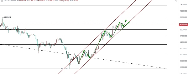 四小时级别昨日白盘回踩66000附近过后下方出现明显的抛压价格再次上涨,在触及上方68500附近压制位过后,行情形成短幅度回调,触及下方66500过后再次向上。目前我们可以看到,在凌晨的行情当中,形成了一个吞没结构。从趋势上来讲,在这一段行情触及底部进行反弹向上的K线排列中,我们可以看到其实有去形成一个上升通道,通道内又形成了浪型结构。目前这一浪在回踩,具体回踩点位目前能够参考的就是上行通道的下边界,来到这样的位置从性价比以及盈亏比来讲,这些位置是具备去做多头。