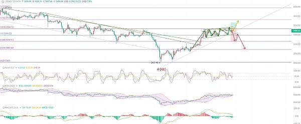 四小时K线目前处于上升旗形三浪已经过了,超短趋势出现较强阻力可以开始实仓空,毕竟EMA趋势指标快慢线开始出现收缩趋势,说明空头有一定的动能,KDJ收缩一直在往下,布林带收缩以后多空距离变窄,上轨压力位给到了3535,下轨支撑还在3465附近,MACD顶部背离时间持续时间很久,DIF和DEA一直在向下扩散企图结束背离,那就要看本周能否探底3300附近的支撑,思路上遇到压力位做空,支撑点做多,灵活一点带好止损两边吃