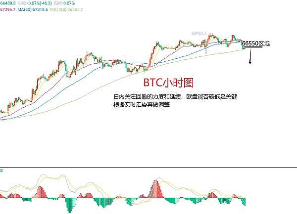 7月23日比特币(BTC)合约技术面分析:今日方面,大周期日线级别昨日报收小阴线,K线形态连阴,价格还是在高位,附图指标缩量金叉运行,这样来说当前的回撤我们还是只能看作修正的走势,而不是承压下跌,因为力度和延续不是很明显,另外价格没有向下破位;短周期小时图美盘价格向上修正,凌晨承压回撤,当前K线形态连阴,价格在均线下方,附图指标快慢线粘合死叉放量运行,那么日内大概率还是要往下修正的,需要关注其力度和延续;因此今日BTC短线合约交易策略:现价66550区域直接空,止损放在66900区域,目标看65800-65600区域;