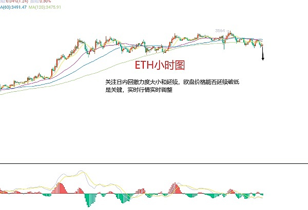 7月23日以太坊(ETH)合约技术面分析:今日方面,大周期日线级别昨日报收小阴线,K线形态连阳单阴价格还是再高位盘整,附图指标金叉运行,那么这就很明显,连续出现的回撤就是修正的走势,而不是行情的反转走势,这一点大家首先要明确,不要把趋势搞错了,不然就要进入误区了;短周期小时图涨跌在区间内,凌晨回撤早间反抽,当前二次承压,K线形态连阴,价格在均线下方,附图指标死叉放量运行,且反抽没有力度,所以日内大概率还是要跌,因此今日ETH短线合约交易策略:现价3450区域直接空,止损3478区域,目标看3400区域