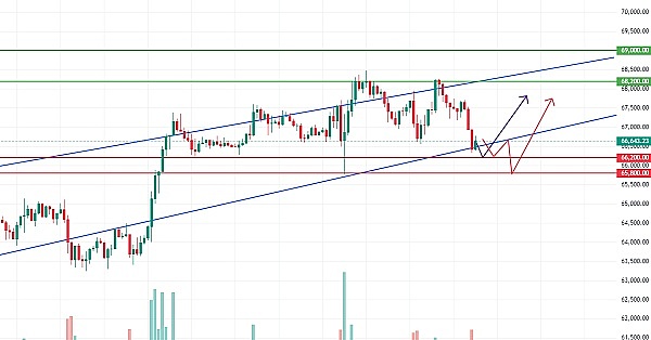 btc目前有许多利好消息使市场处于过热状态,支撑进场,压力出,如果说突破第一压力位则观察是否企稳68000这条线,能企稳才有机会突破69000。支撑位参考:66200—65800.做多入场位参考:66200-66600区间分批做多 防守500点 目标67350-68200做空入场位参考:69000-69400区间分批做空 防守500点 目标68200-67350